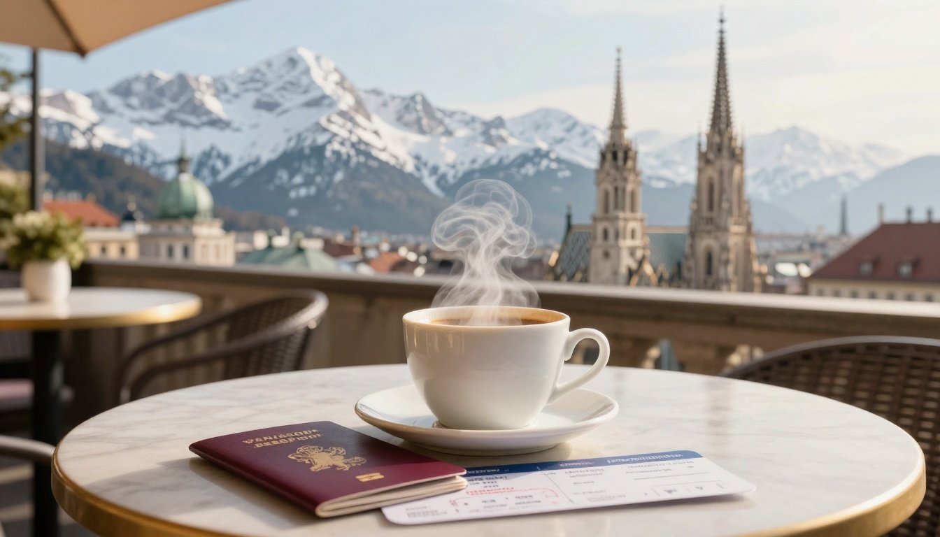 This image captures Austria’s allure, from alpine peaks to city charm, with key travel docs ready for inspection.