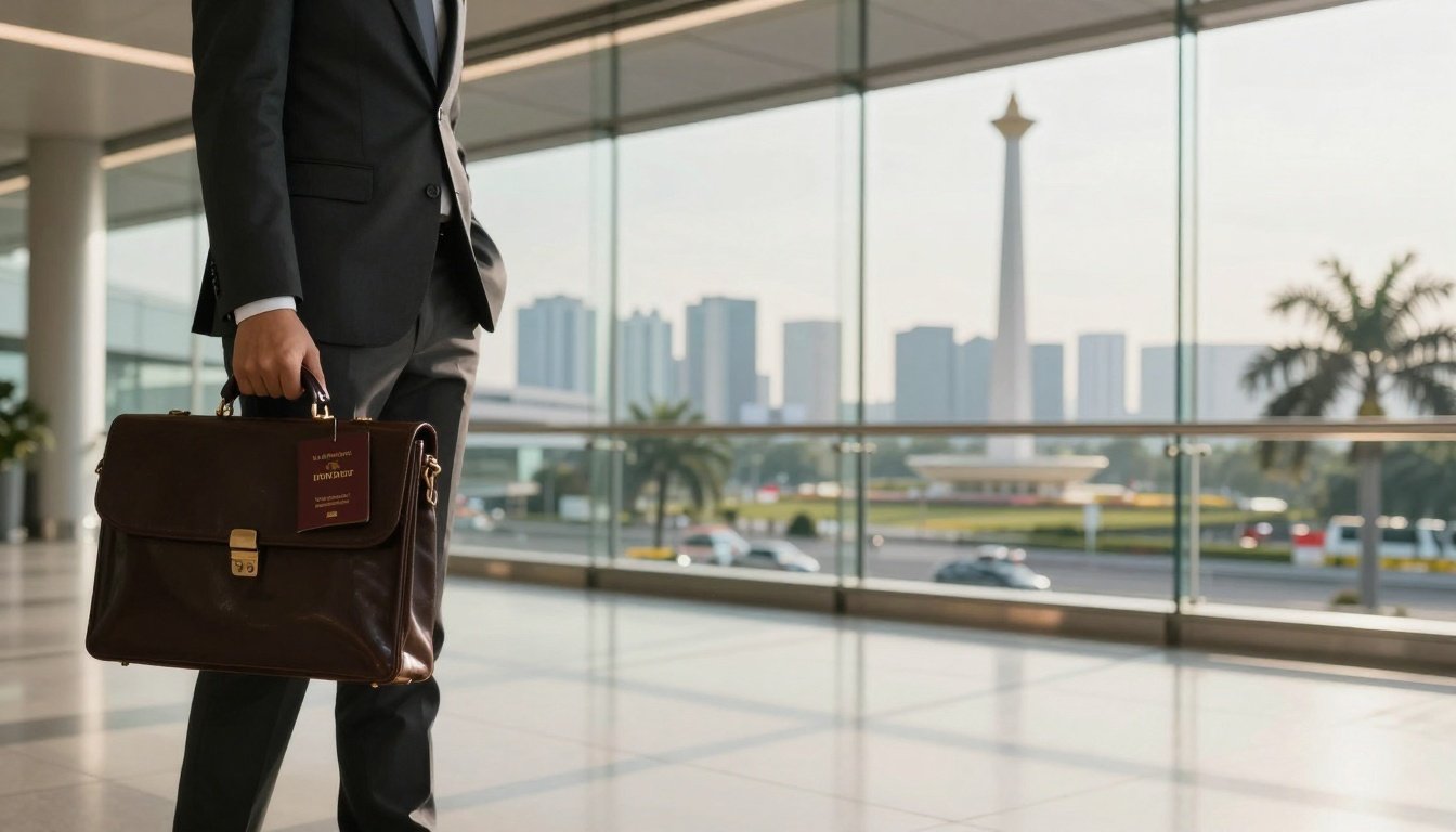 Image suggestion: A professional holding a passport at Jakarta airport with Indonesian flag.