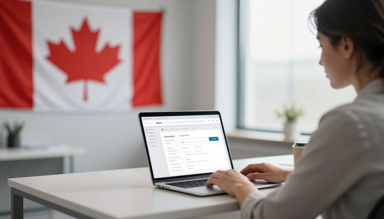 Person checks Canada visa status on a laptop in a modern office with a Canadian flag nearby.