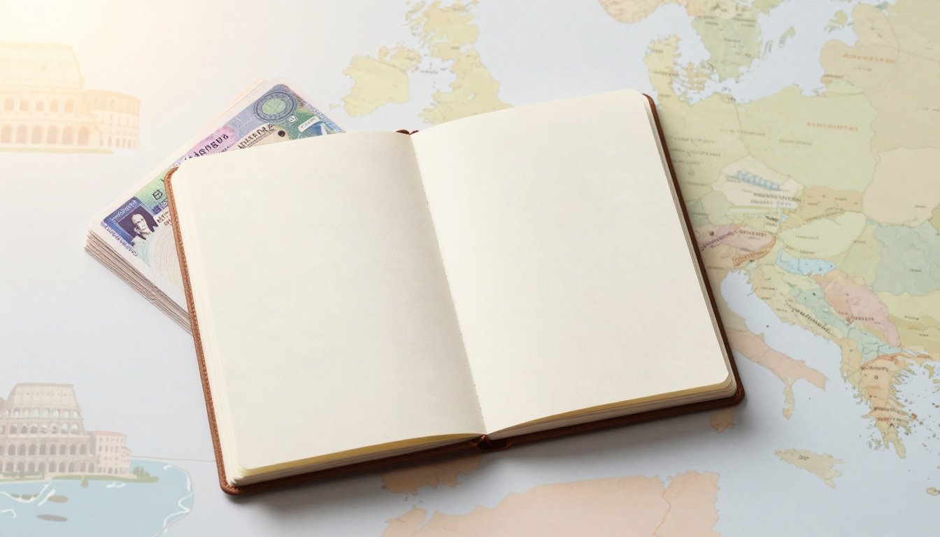 Open passport with Italian visa stamps beside a map and Colosseum