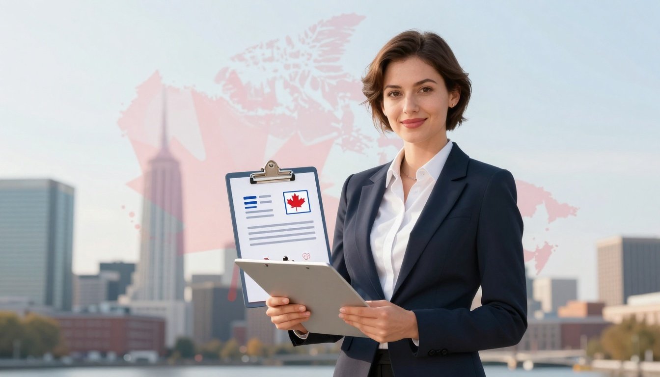 A smiling professional Canadian office worker holds a work permit and passport confidently. Subtle French flag colors blend with Canadian maple leaf elements on a modern desk with laptop and coffee mug under natural daylight.