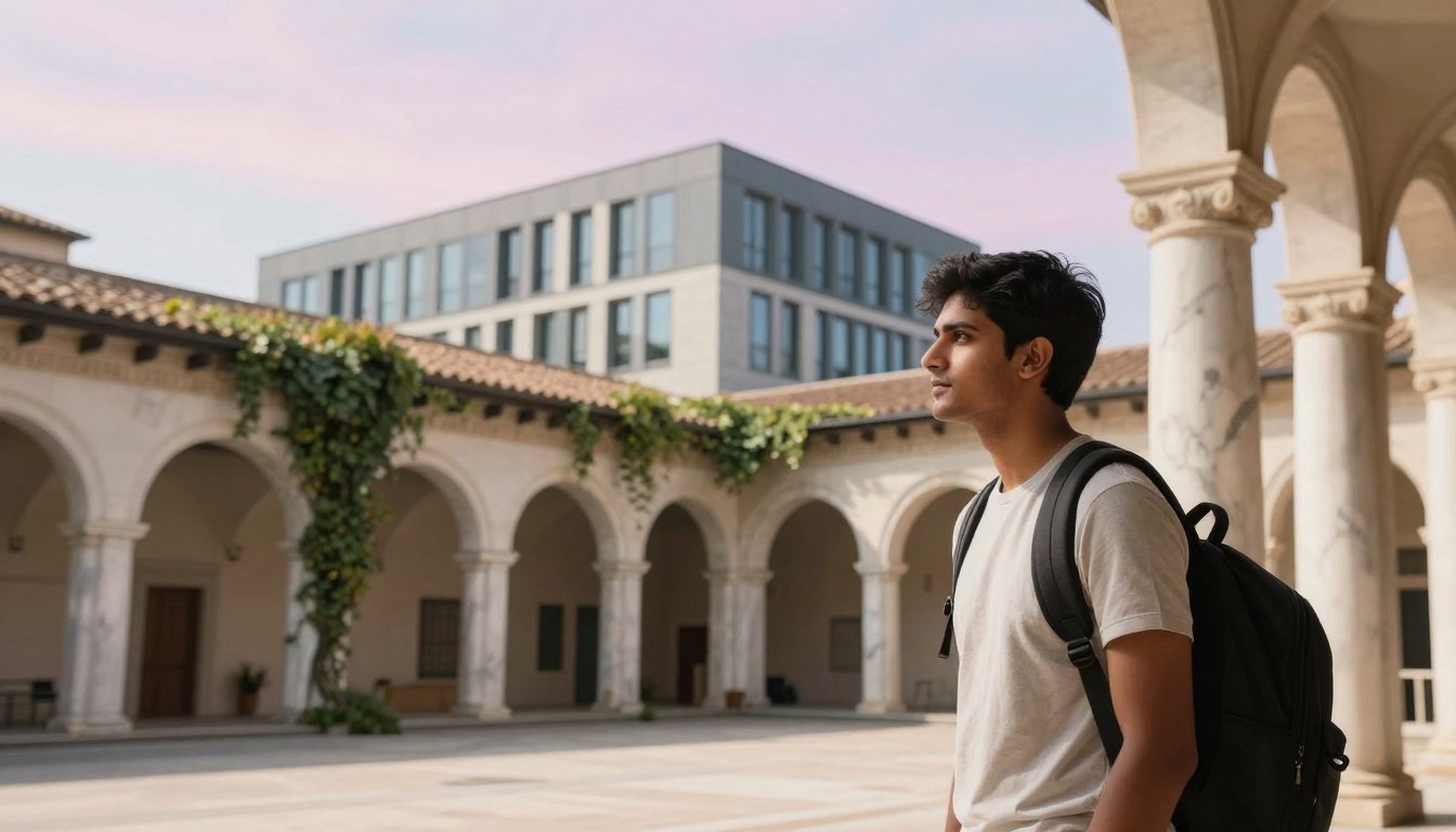 An Indian student celebrates a scholarship win on a historic Italian campus, with sunlit architecture in view.