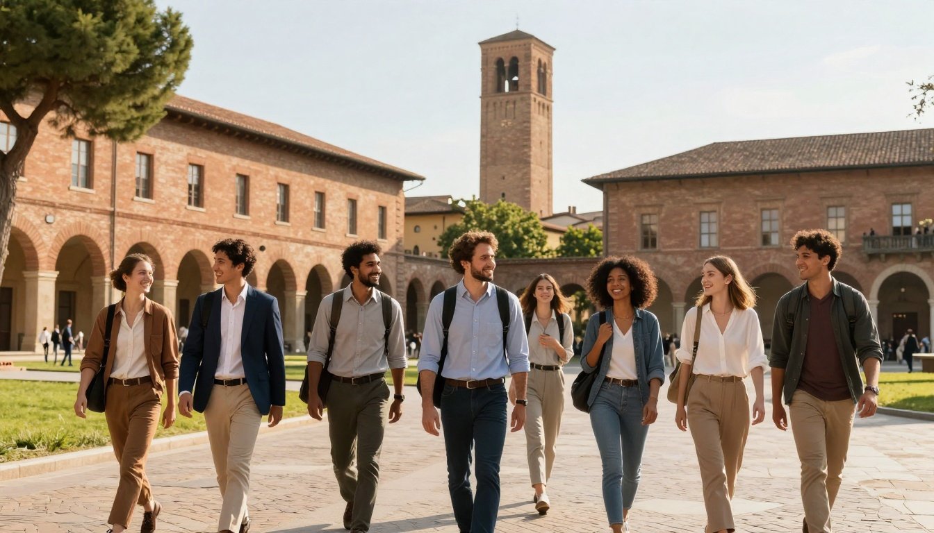 Group of smiling international students strolls across a historic Italian campus on a sunny day.