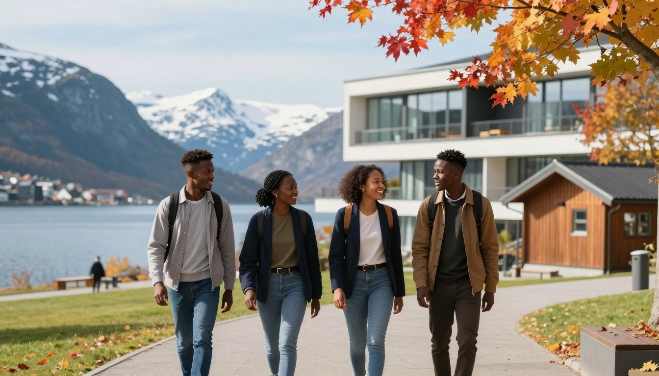 African students on a Norwegian campus in autumn, chatting near fjords.
