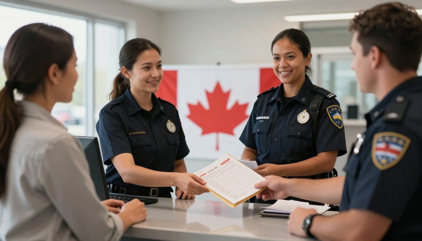 Person at Canadian border control submitting TRP documents to CBSA officer