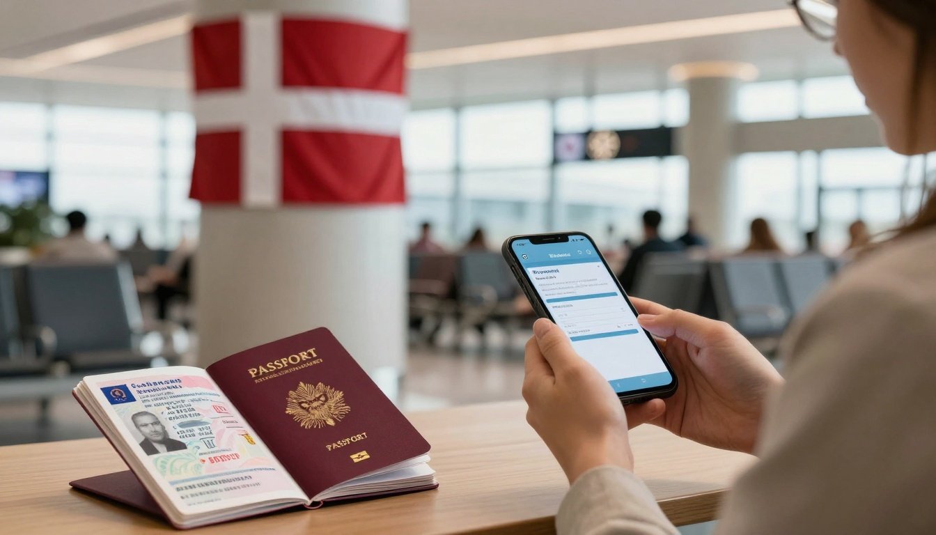 Traveler reviews Denmark visa status on a phone amid airport bustle, Danish flag waving nearby.
